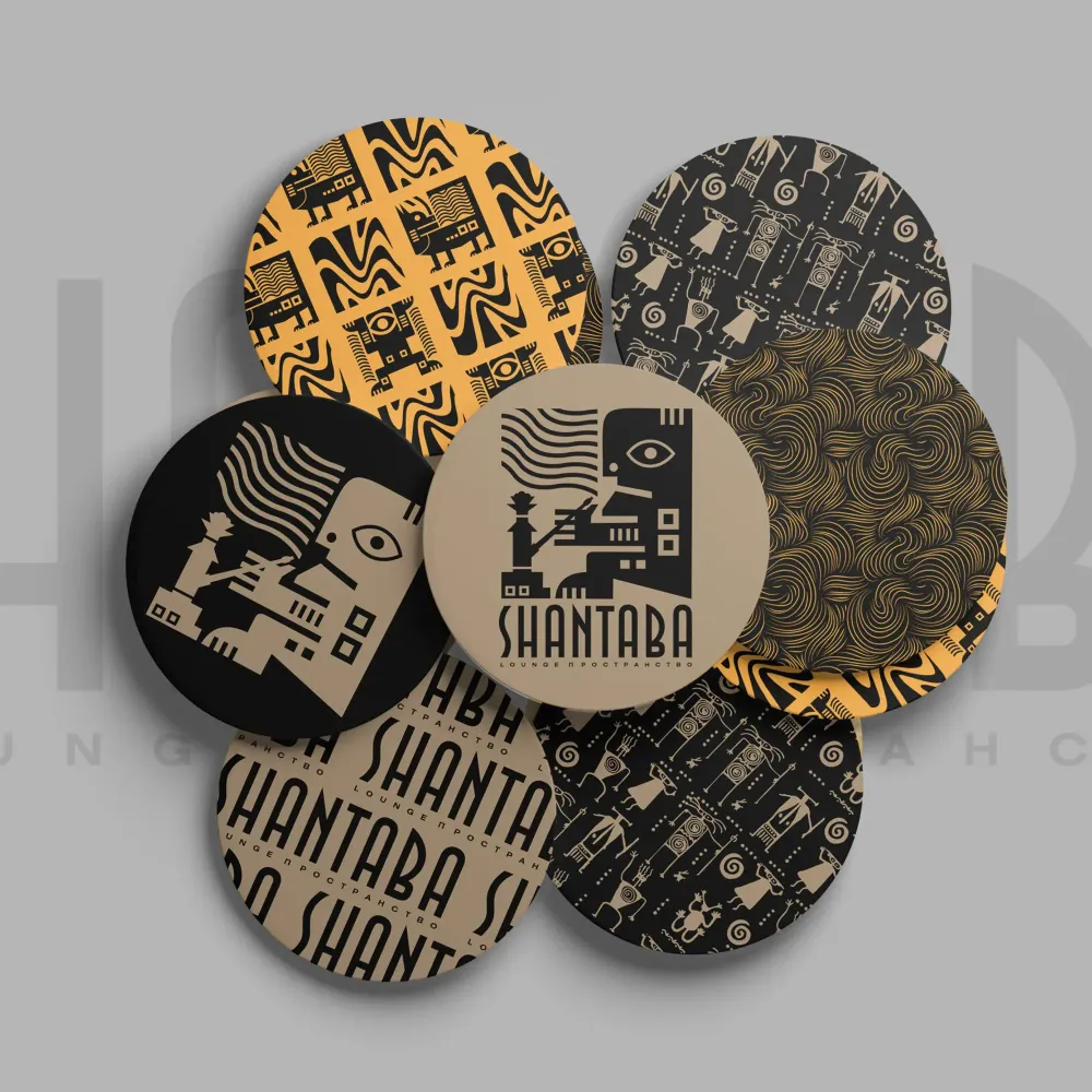 Фирменная цветовая гамма бренда SHANTABA была выбрана с учетом африканских культурных традиций, передающих атмосферу загадочности и красоты континента. Яркий оранжевый цвет символизирует тепло солнца, белый ассоциируется с чистотой и надежностью, черный добавляет элегантности и престижа, а металлический бежевый создает ощущение таинственности и связи с пустынными ландшафтами. Логотип бренда представлен в виде фигурки человека, курящего кальян, выполненной в африканском стиле. Фирменный стиль включает в себя витиеватые линии дыма, напоминающие движение ветра, а также образы африканцев в национальных костюмах, подчеркивающие культурную идентичность.